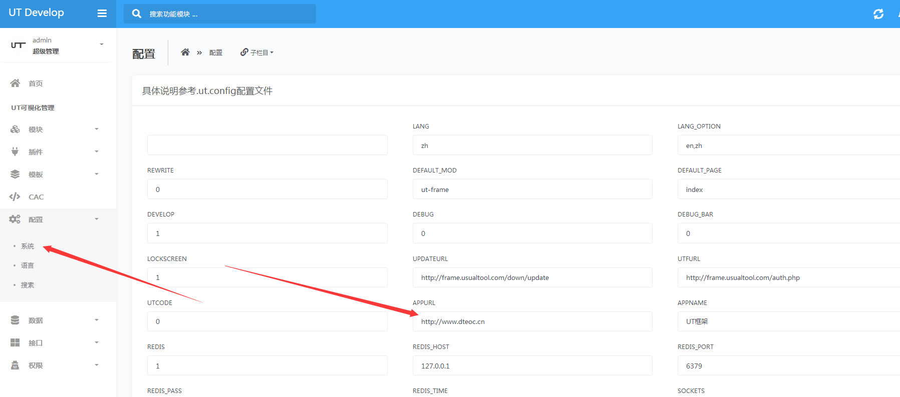 可以手工修改.ut.config,也可以在后台配置里修改,效果是一样的,如下图:
