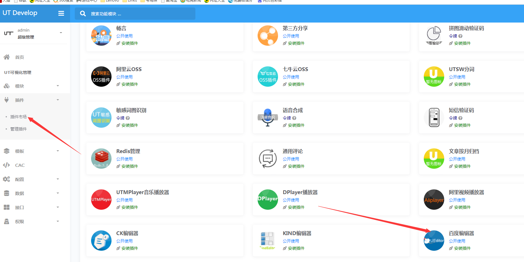 如果.ut.config中的EDITOR=ueditor设置了编辑器,就需要在后台的插件市场里下载该插件,否则就不会显示。